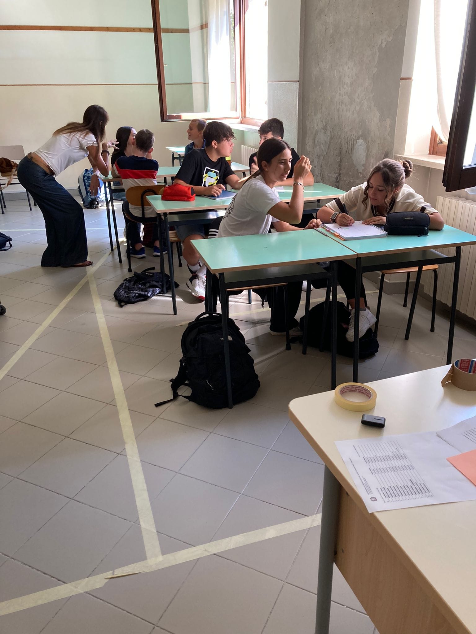 L’insegnante ci ha chiesto di produrre una piantina della classe e di disegnare lo spazio che avremmo occupato a cui abbiamo assegnato un nome, una bandiera e disegnato il perimetro con lo scotch di carta sul pavimento.