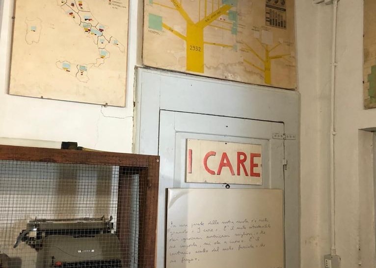 1954 fino a giugno del 1967 fece scuola come unica possibilità per mettere i poveri, lontani da mezzi e denari, in condizione di pensare, capire, conoscere da uomini liberi e autonomi.”Fare strada ai poveri senza farsi strada” per valorizzare le differenze culturali e il rispetto verso tutti i popoli. La scuola di Barbiana, nella quale il priore amò quotidianamente come propri i figli dei poveri, nella speranza del loro riscatto, fu un piccolo e prezioso laboratorio di “utopia concreta “. I ragazzi di terza c hanno potuto confermare che lassù nulla è cambiato: le cartine e l’atlante storico alle pareti, l’ astrolabio, la camera oscura per le foto. E quelle due parole scritte in rosso e stampatello su una porta: I CARE . Per restituire ai più umili la consapevolezza della loro dignità e risvegliare quella naturale sete di sapere che è fiducia nella vita. Don Milani sacerdote, educatore, testimone di pace, indica ancora una volta un sentiero a tutti gli educatori: la passione nella relazione insieme alla capacità di dissotterrare tesori nascosti e di valorizzare le differenze, il valore e la funzione della parola, la necessità di un fine, la crescita di cittadini responsabili e sovrani, che fa avanzare l’umanità verso orizzonti di giustizia e di pace.
